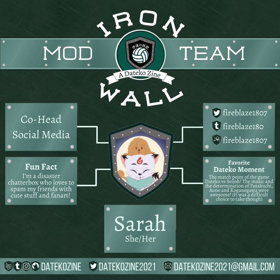Mod Sarah Head, social media and organizer mod for Acorn & Arkenstone (Bagginshield zine)General mod for Distortion (Shigaraki zine)Intern for Quirk no Jutsu (Naruto x BNHA crossover zine)Intern for Symbol of Fear (All for One zine)