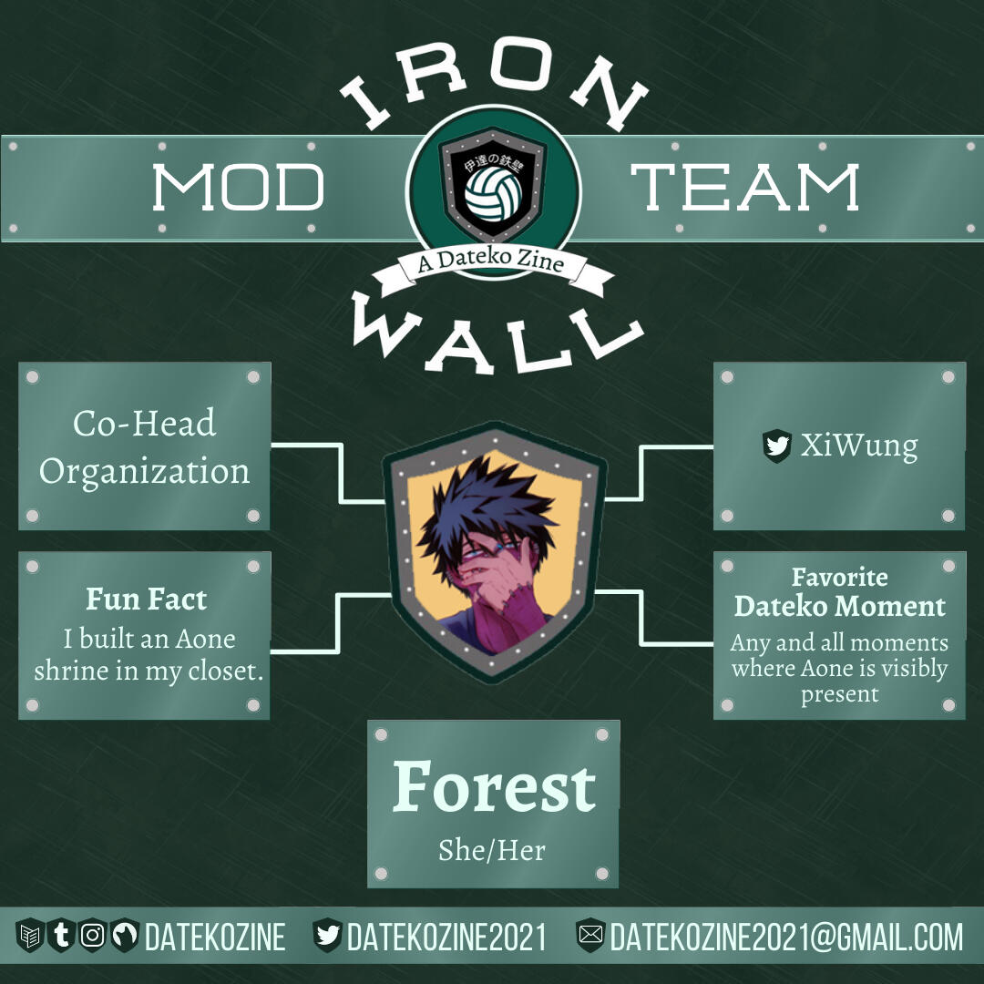 Mod Forest Organization mod for Boku no boys (BNHA Boys Zine)Head and organization mod of One Big Night (BNHA prom zine)Head, social media and organization mod for Dabi’s Journey (Dabi Tarot Card zine)Head and organization mod for Symbol of Fear (All for One zine)Other projects as mod